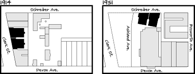From 1929 to at least 1988 Ashland ran through what had functioned as the alley behind the buildings fronting on Clark, creating an awkward triangular greenspace to the west.